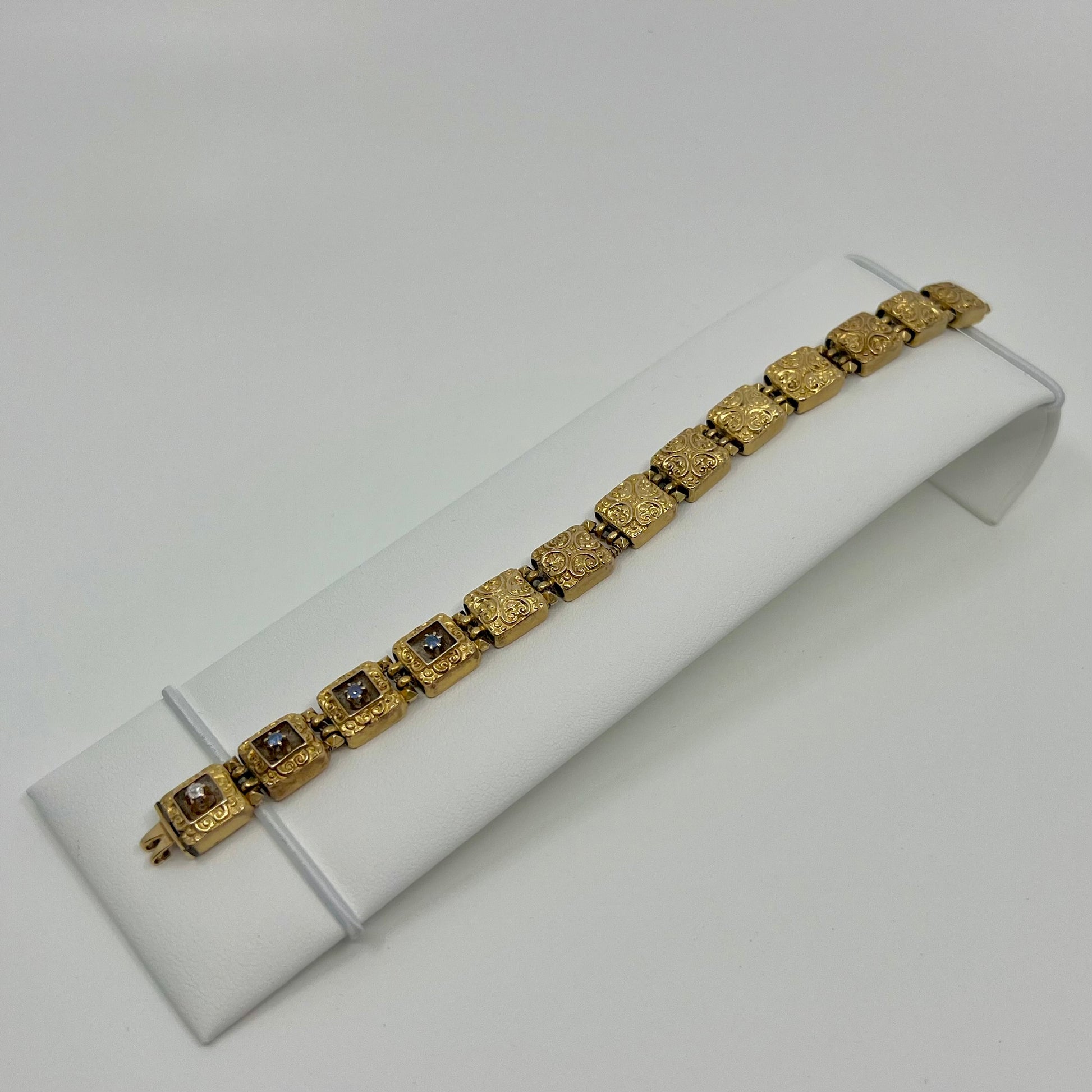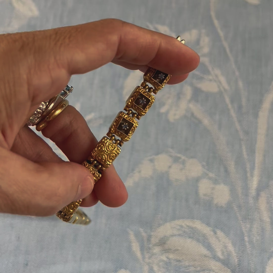 What a treasure!  This 18kt gold Victorian (mid 1800s) bracelet features repousse links and hidden internal wire coil mechanisms which allows the bracelet to stretch.  There are three small sapphires (2.3mm) and one old mine cut diamond (2.5mm.)  The bracelet measures 6.75" and expands to 8.5" and has a luxurious bloomed finish.