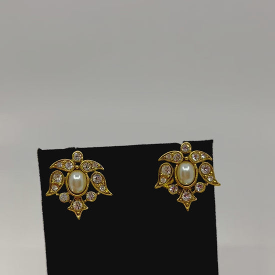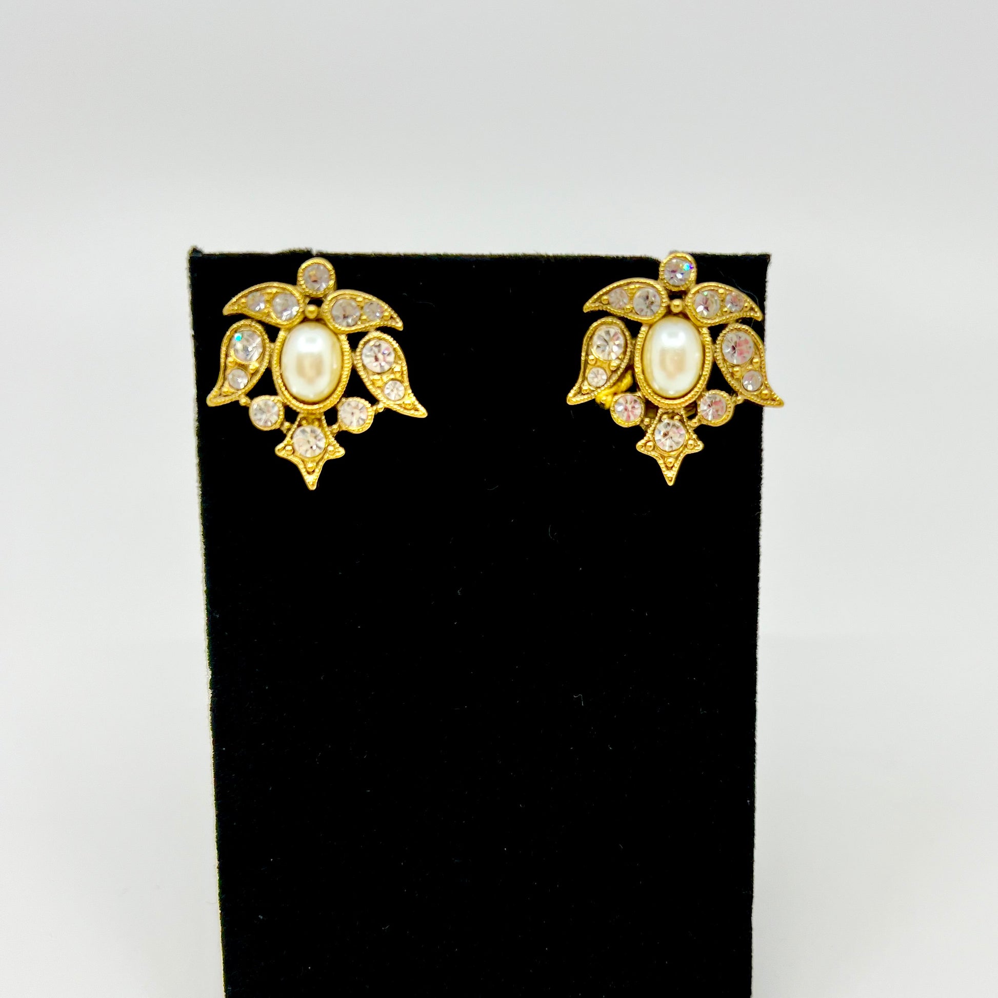goldtone costume earrings with faux pearls & rhinestones, pierced, 24mm long