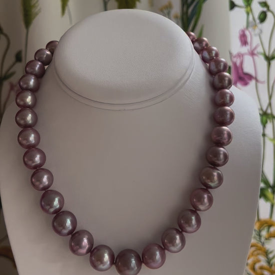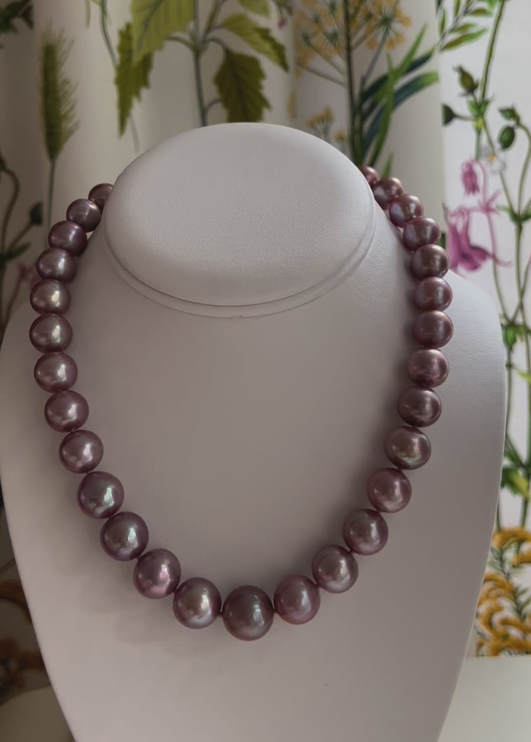 Naturally pink and naturally classic - edison pearl necklace 17" long, hand knotted on gray silk with a 14kt rose gold clasp.  Pearls are a glamorous size at 11  - 14mm.