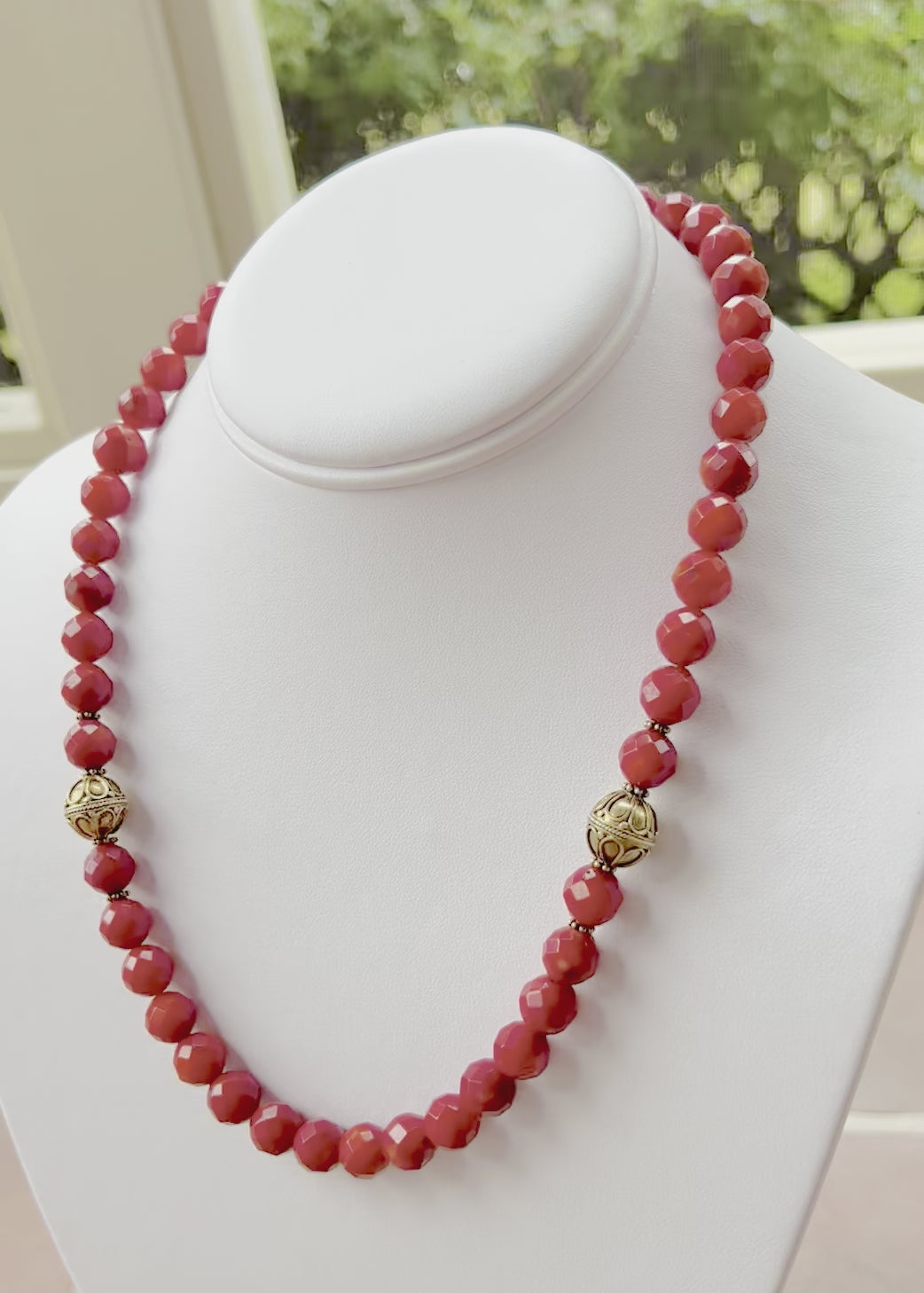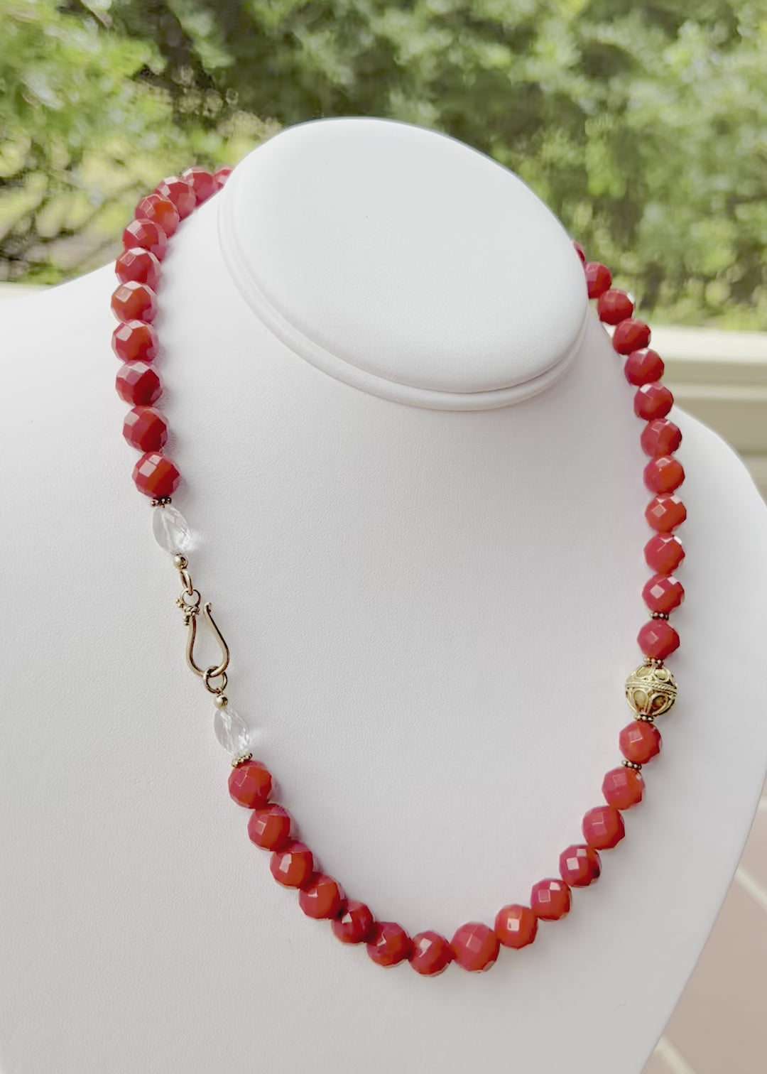 Faceted coral bead necklace with 24kt vermeil Bali accents & rock crystal bead accents, 20" long.
