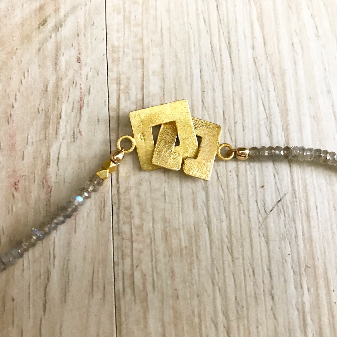 pink pearl fringe on labradorite bead necklace, large labradorite bead accents.  gold plating over copper accent beads.  sterling / 18kt vermeil square interlocking clasp. 23 inches long.