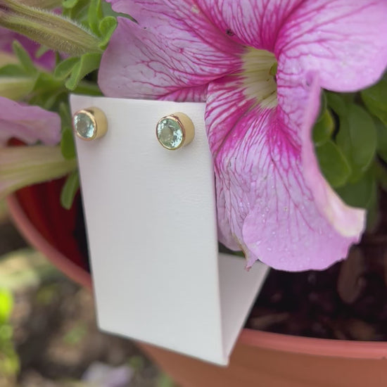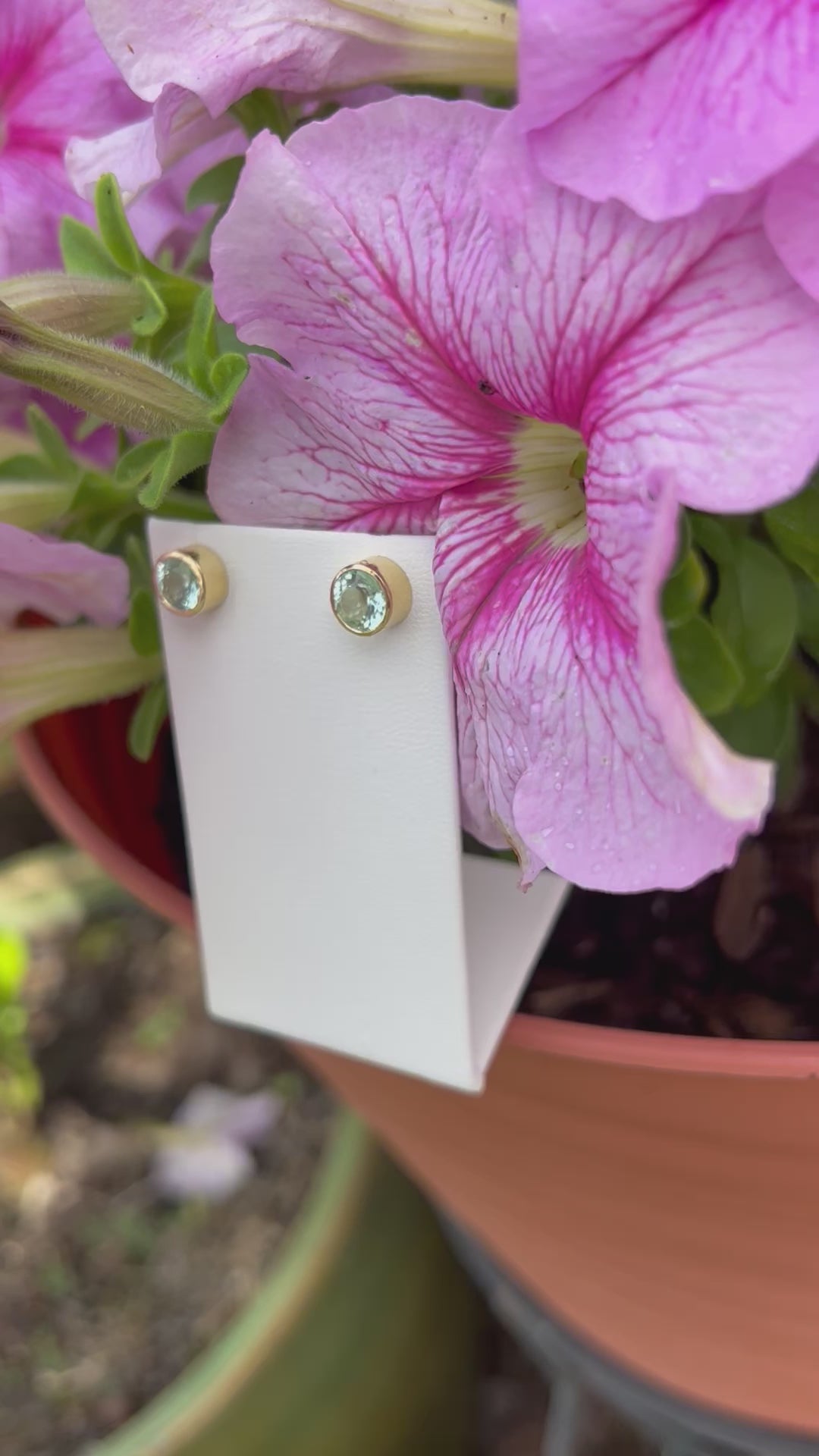 Fresh, light, minty green Afghan tourmalines set in 18kt earring bezels and finished with extra large backs.  2.24ctw. 7mm each.
