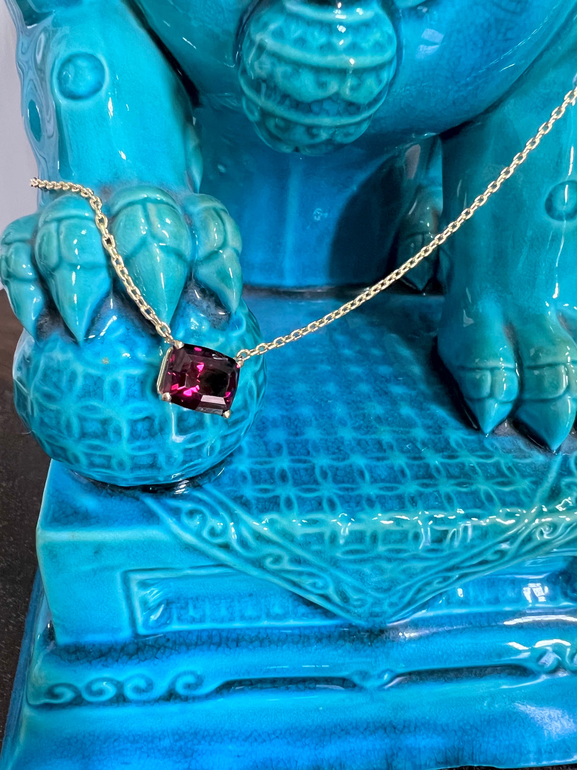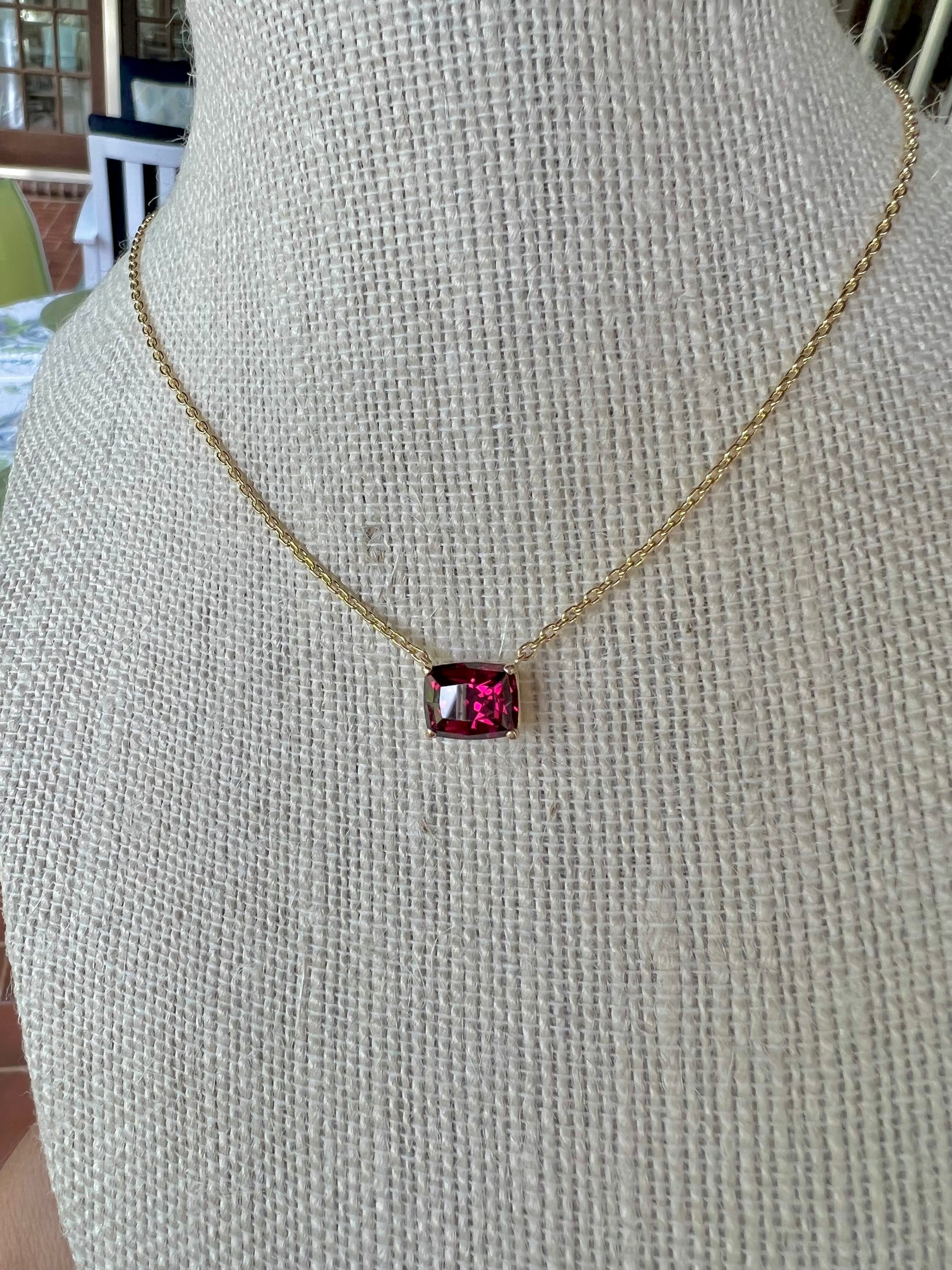 This intense, moody, passionate Mahenge rhodolite garnet stands alone and also plays well with others.  In 18kt gold, 16.6 inches long.  5.26ct pillow cut measures 10.4x8.4x6.7mm.