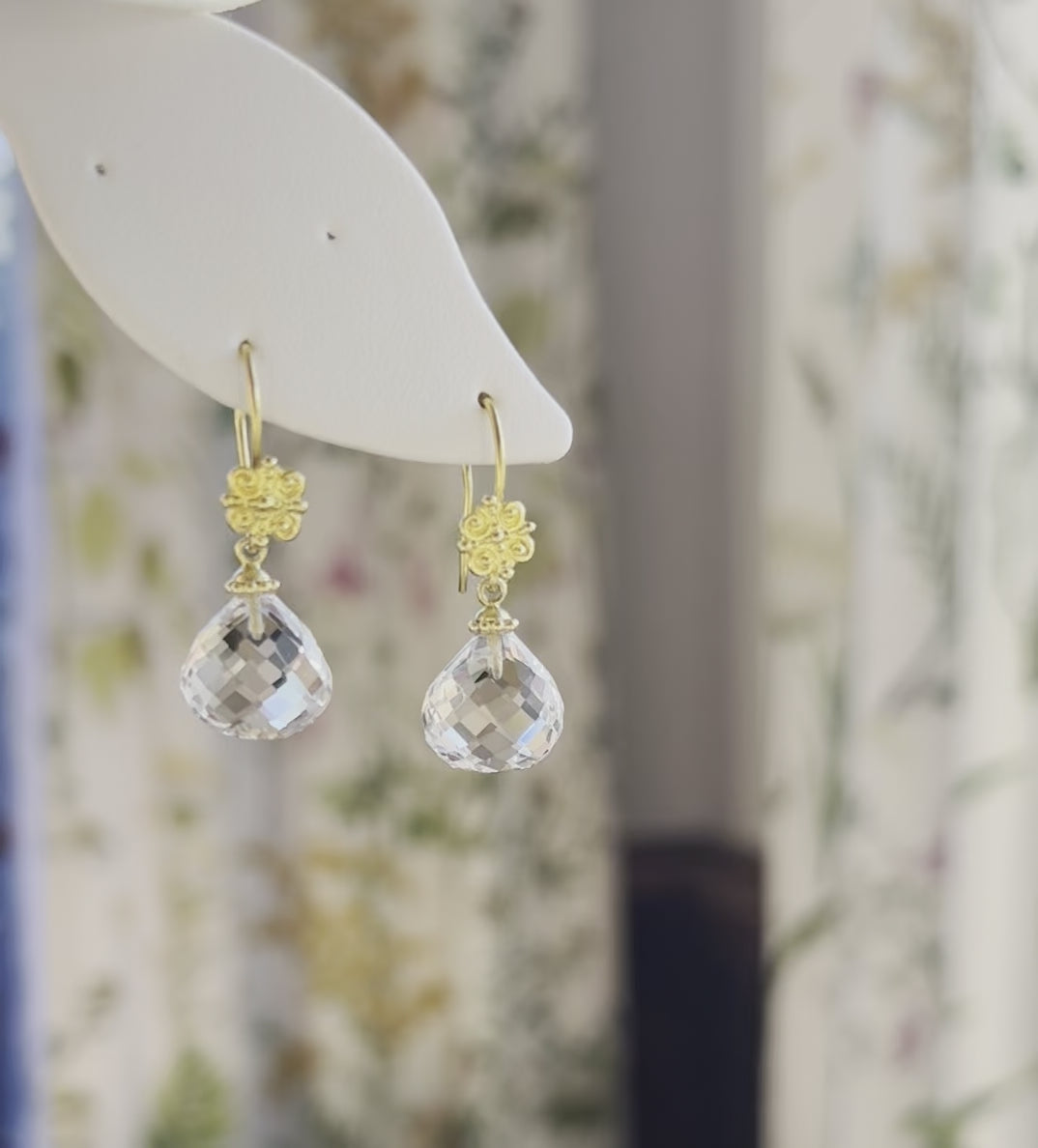 Rock Crystal briolette drop earrings with 22kt gold [13 x 12mm gems @ 14.56ctw]